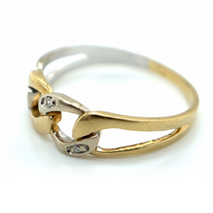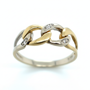 Designed in an elegant curb chain link style, the ring symbolises strength and sophistication. The contrast between rich 18ct yellow gold and sleek 18ct white gold creates a visually striking finish, while three natural round brilliant cut diamonds add a subtle yet eye-catching sparkle.
