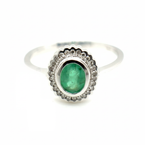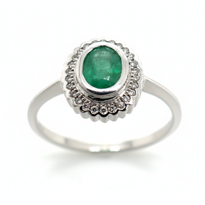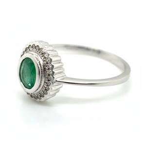 At its centre sits a striking natural oval-shaped emerald, prized for its rich green hue and enduring appeal. Surrounding the emerald is a dazzling cluster of 26 round brilliant cut diamonds, carefully set to enhance brilliance and create a stunning halo effect.
