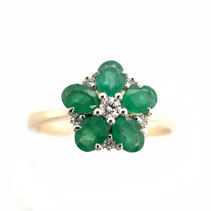 A timeless 9ct yellow and white gold flower ring featuring a sparkling central diamond surrounded by five natural oval-cut emeralds. Elegant, colourful and beautifully crafted.
