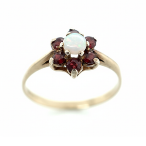A charming 9ct yellow gold ladies’ cluster ring featuring a natural round opal centre surrounded by six sparkling garnets in a floral arrangement.