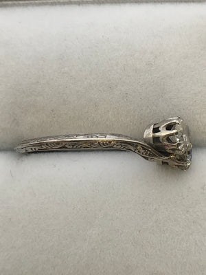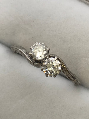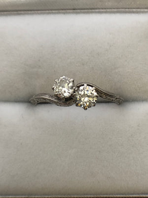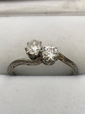 Two old hand cut diamonds are each individually claw set at the centre of the ring. These diamonds are set directly opposite each other in a twist. The shoulders of the ring curve around these diamonds in a thoughtful way, joining the two diamonds together. The shoulders have also been engraved elegantly with intricate scroll patterns. This engraving has been done by hand with a diamond tip.