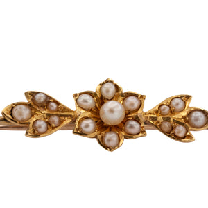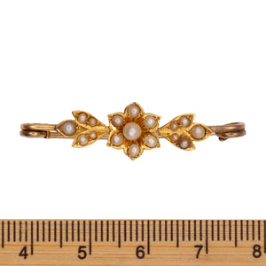 The golden flower at the center is set with seven seed pearls, and is flanked on each side by a gold leaf.