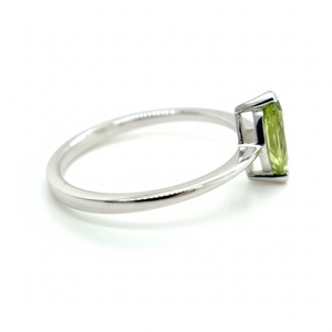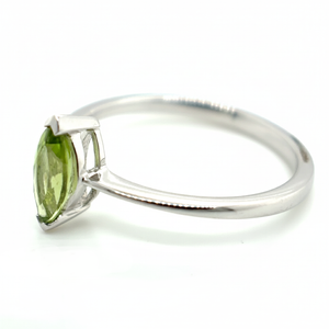 The ring showcases a single natural marquise-cut peridot with a lively green hue, set securely in a classic solitaire style. The sleek 9ct white gold band provides a polished, contemporary finish, enhancing the vivid green of the gemstone while ensuring comfort and durability for everyday wear.