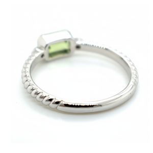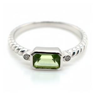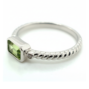 Unique 9ct white gold marquise peridot and diamond ring, featuring a baguette-cut peridot, two round diamonds, and a rope-style band covering three-quarters of the ring. Pre-owned, size N.