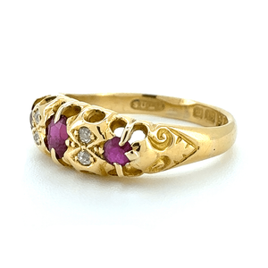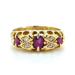This beautiful 18ct Yellow Gold Ruby and Diamond Ring showcases a refined fancy design, combining rich colour with classic sparkle.