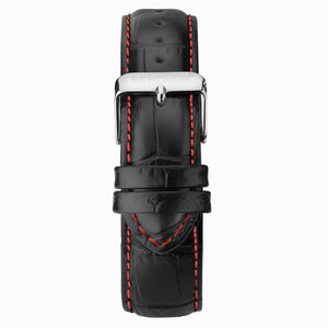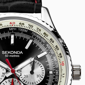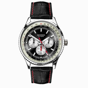 The Sekonda Maverick Men’s Watch features a 43mm silver-tone case, black dial with white chapter ring, and a black leather strap. Practical and stylish, it includes a 24-hour display, day/date function, and 50-metre water resistance.
