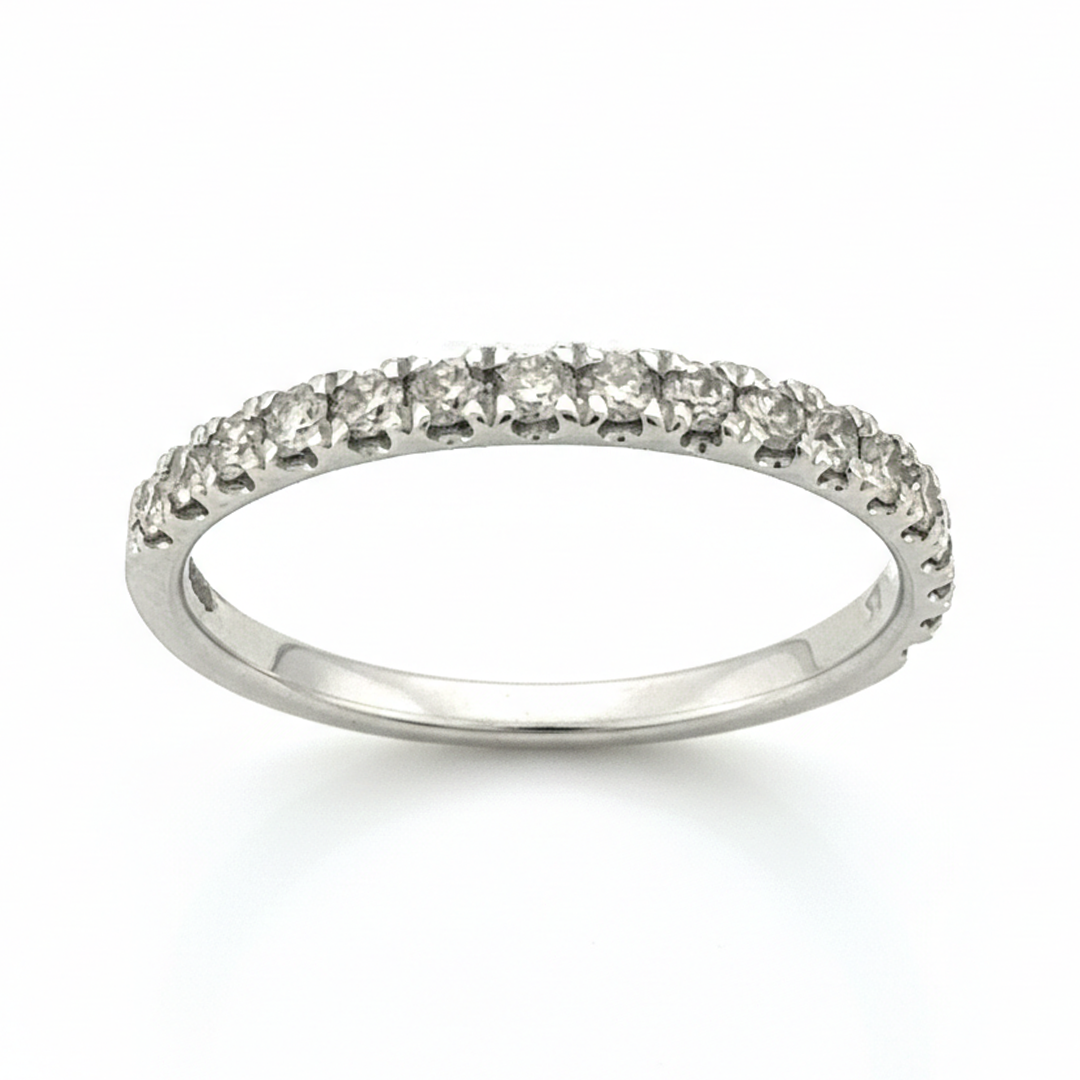 The bright white gold setting enhances the brilliance of the diamonds, creating a seamless and luminous finish. The half eternity style offers both beauty and practicality providing stunning sparkle from the top view while ensuring comfortable everyday wear.