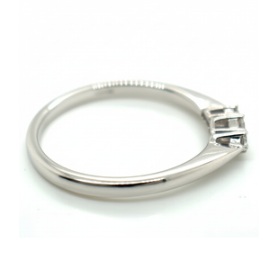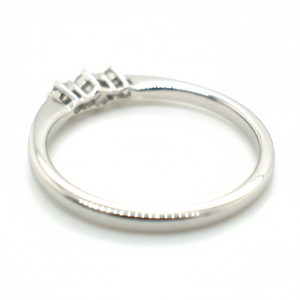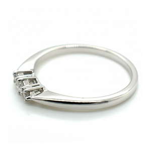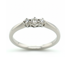 Timeless 9ct white gold 3-stone diamond ring set with three natural round brilliant diamonds totalling approx. 0.20ct. Pre-owned, size R ½, elegant and classic.