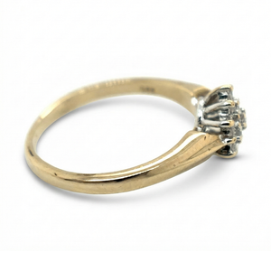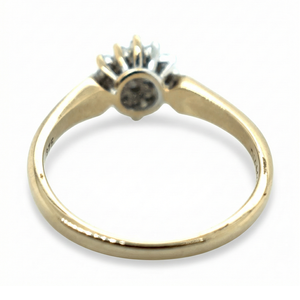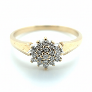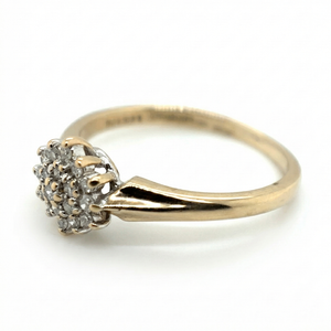 A timeless 9ct yellow and white gold diamond cluster ring set with 19 natural round brilliant cut diamonds. Hallmarked and pre-owned, offering elegant sparkle and enduring style.