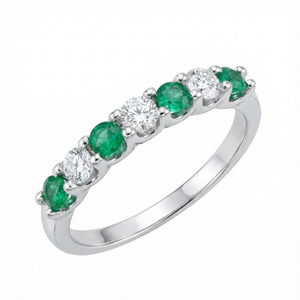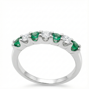 Elegant 14ct white gold emerald and diamond 7-stone ring featuring a round brilliant cut emerald with diamond accents. A classic and refined design, perfect for everyday wear or special occasions.
