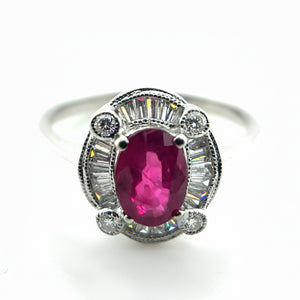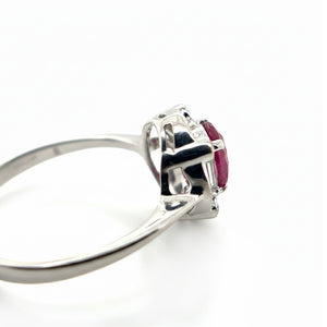 A luxurious 18ct white gold ring featuring a 5x7mm natural oval ruby surrounded by 24 sparkling diamonds. Brand new, elegant, and perfect as a statement gemstone ring.
