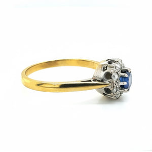 A stunning cluster ring featuring a natural round brilliant cut sapphire surrounded by eight sparkling diamonds. Set in a platinum head with an 18ct yellow gold band, this classic design blends elegance and timeless beauty. Perfect for any special occasion.