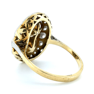 The combination of 18ct yellow and white gold enhances the architectural lines of the design — the yellow gold providing warmth and richness, while the white gold setting intensifies the brilliance of the diamonds. The cluster formation offers bold finger coverage, characteristic of authentic Art Deco craftsmanship.
