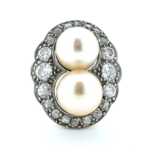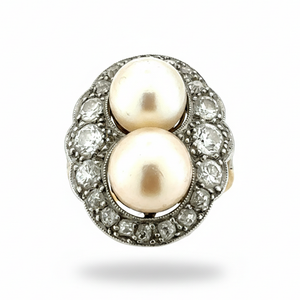 A striking vintage Art Deco 18ct gold cluster ring featuring two natural pearls and approximately 1ct of brilliant-cut diamonds. Bold, elegant and full of period charm.