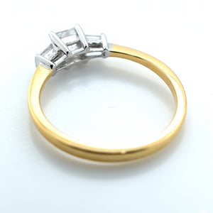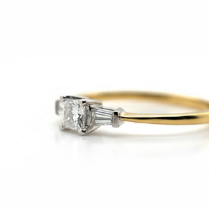 A timeless 18ct yellow gold ring featuring a princess-cut natural diamond with tapered baguette shoulder diamonds. Elegant, brand new, and perfect for engagements or special occasions.