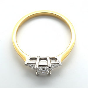 beautiful 18ct yellow gold ring featuring a princess-cut natural diamond with triangle-cut shoulder diamonds, brand new, elegant, and perfect for special occasions.