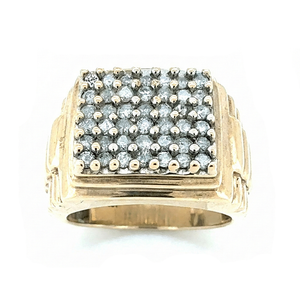 A luxurious 9ct yellow gold fancy signet ring set with 42 natural brilliant-cut diamonds, combining classic style with sparkling sophistication.