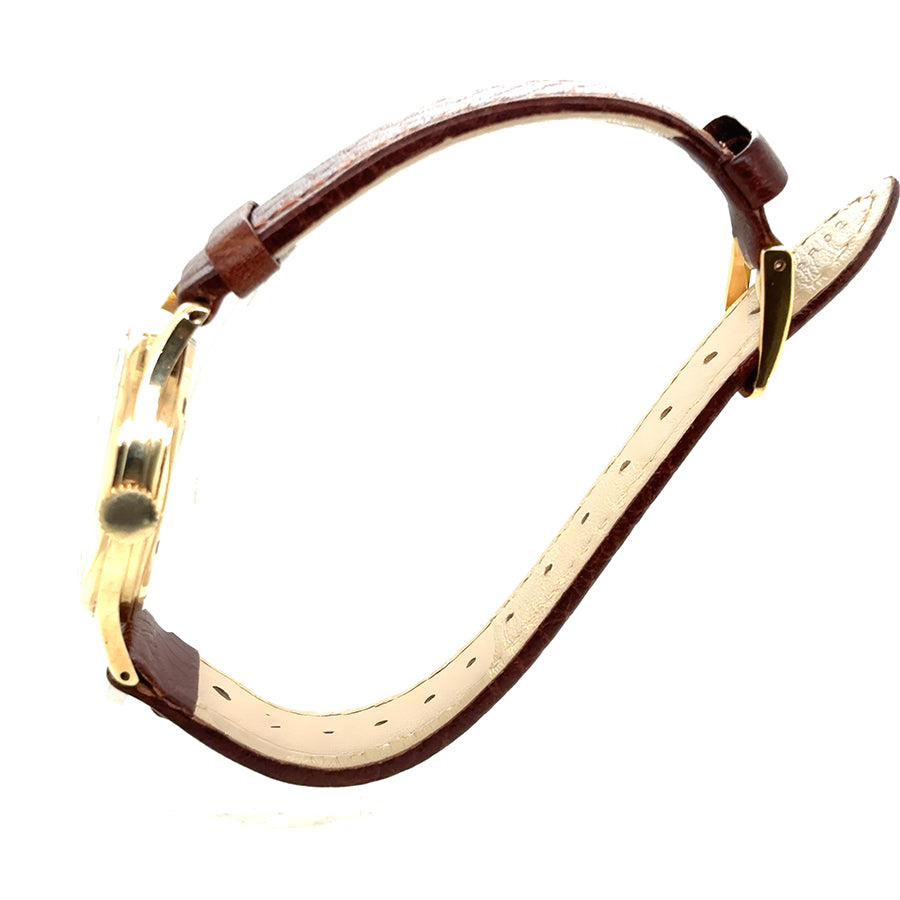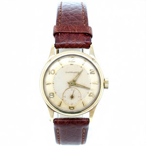 A refined vintage 9ct Yellow Gold Garrard men’s watch featuring a classic gold dial with Arabic numerals, a 33mm solid gold case, and a brown leather strap. Powered by a traditional mechanical movement, this 1989 pre-owned timepiece offers timeless elegance and true British craftsmanship.