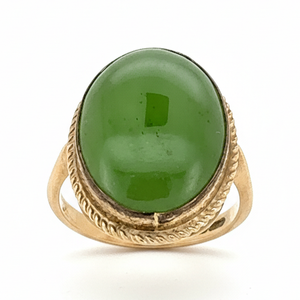 A classic 9ct yellow gold signet ring set with a natural oval jadeite, showcasing rich green tones and timeless sophistication.