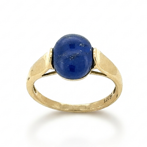 The rich, multi-tonal blue hues of the lapis contrast beautifully against the warm glow of yellow gold, resulting in a piece that is both eye-catching and elegant. The minimalist setting allows the gemstone to take centre stage, making this ring ideal for everyday wear or as a standout accessory for special occasions.