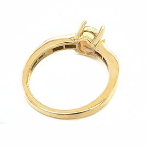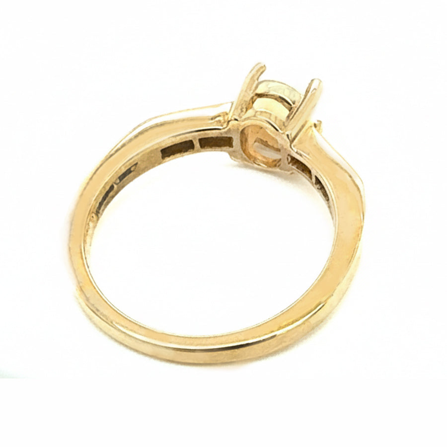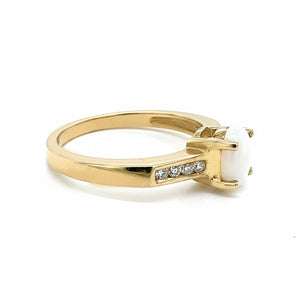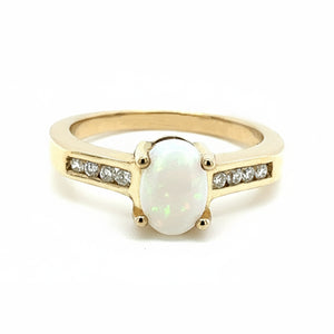 A stunning 9ct Yellow Gold Ring featuring a natural oval opal at the centre, accented by four diamonds on each shoulder. Elegant, colourful, and perfect for any occasion.