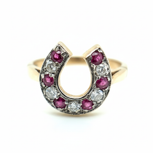A charming 9ct yellow gold horseshoe ring featuring natural round brilliant cut rubies accented with sparkling diamonds, a timeless symbol of luck and elegance.