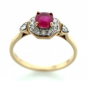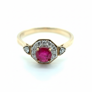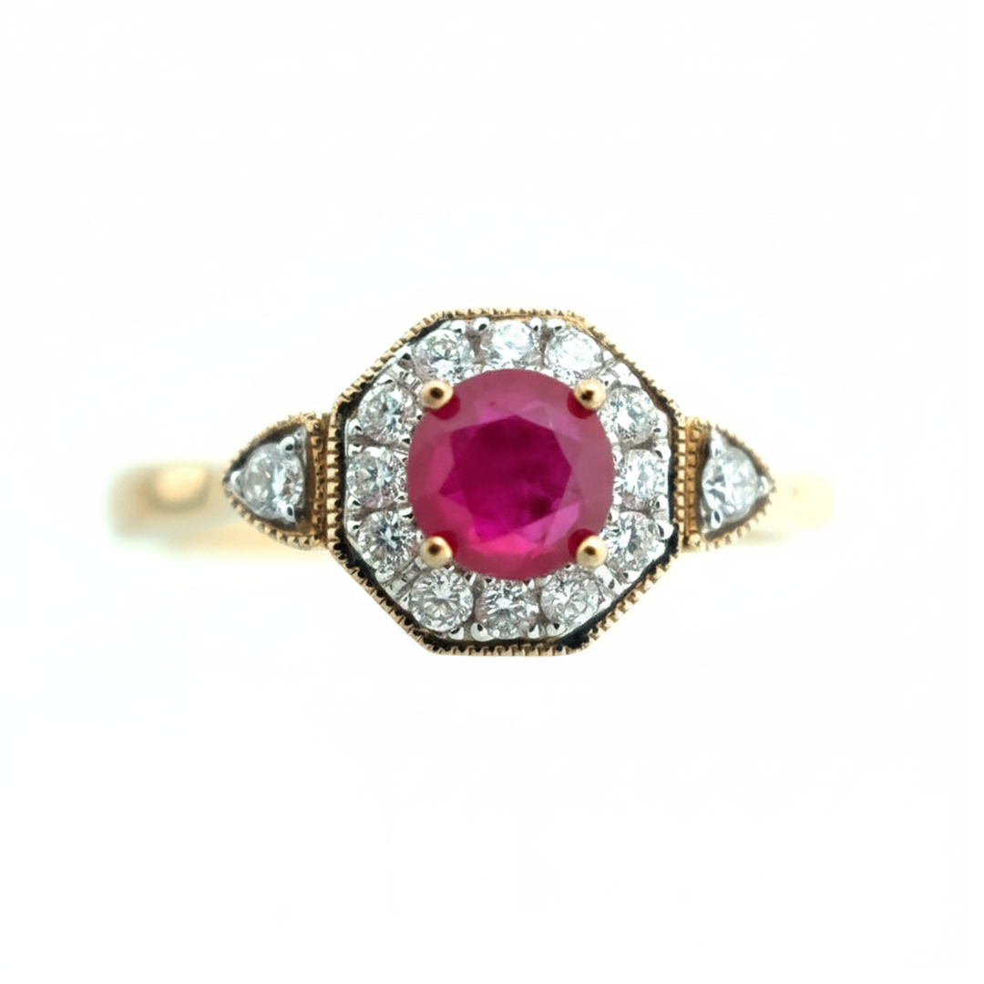 An elegant 9ct yellow gold ring featuring a natural round brilliant cut ruby surrounded by a sparkling octagonal halo of diamonds, with additional diamonds set on each shoulder.