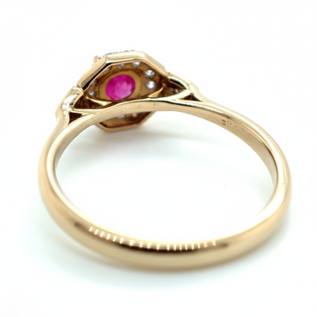 Encircling the ruby is an elegant octagonal halo of round brilliant cut diamonds, creating a bold yet refined frame that enhances the centre stone. Adding further sparkle, two additional diamonds are set on the shoulders of the ring, completing the design with balance and sophistication. Together, the diamonds total 0.17ct, offering a radiant contrast against the warm tone of the 9ct yellow gold setting.
