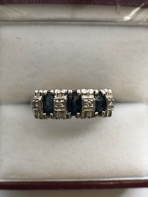 These sapphires are interspaced by four round brilliant cut diamonds which are claw set in square box settings.