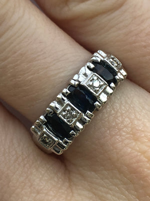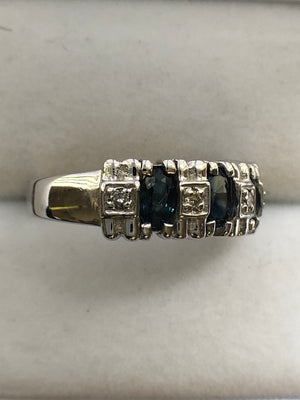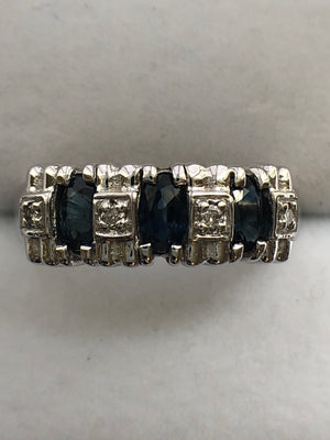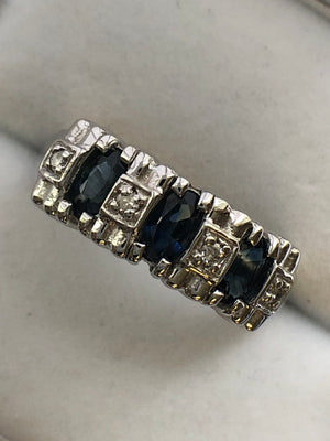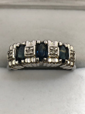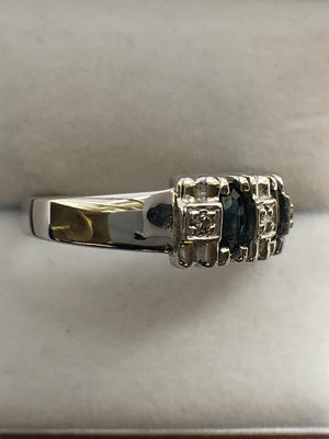 Each of the three sapphires measures 5 x 3 mm's, and combined have an estimated total weight of 0.80 carats.