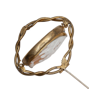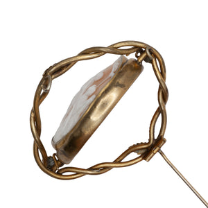 An oval shape cameo with music scene in white, with a brown background surrounded by gold coloured twine with leaves.
