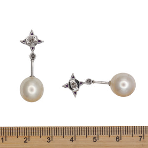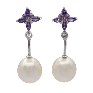A pair of 18ct white gold pearl, amethyst, and diamond earrings.