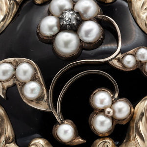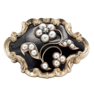 • A Victorian diamond, onyx, and seed Pearl mourning brooch.