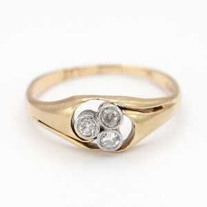 At the centre of the ring is a cluster of three small diamonds all mounted in platinum rub over setting. These diamonds are set inside a 18ct gold ring.