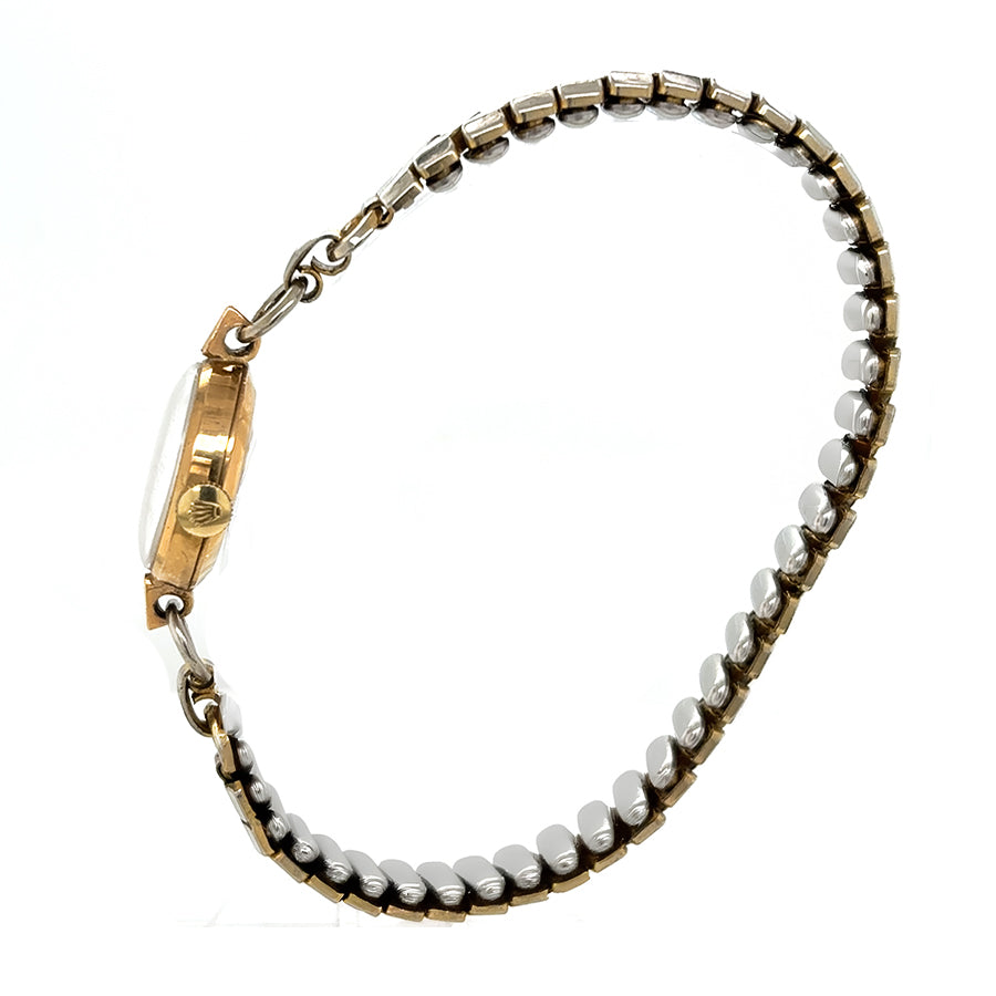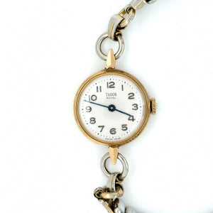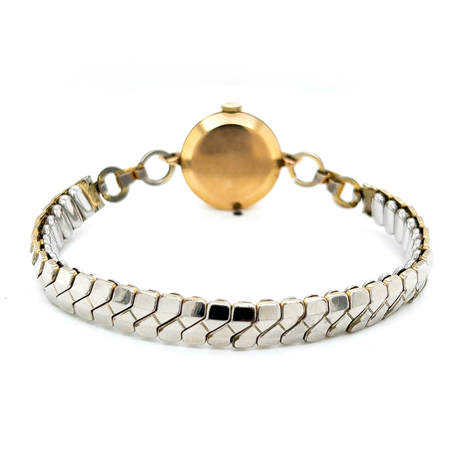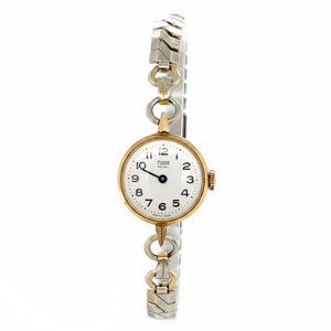Vintage 1973 Ladies Tudor Royal Watch featuring a champagne dial with Arabic numerals, an 18mm gold case, and a silver stainless steel bracelet. Powered by a reliable mechanical movement, this pre-owned timepiece offers timeless elegance and classic Swiss craftsmanship.