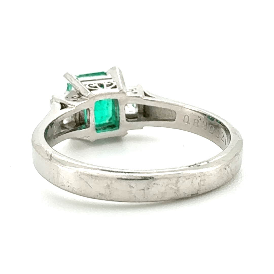 This Platinum Emerald and Diamond Ring is a striking example of refined craftsmanship and classic design. The central baguette-cut emerald, weighing 0.89ct, is beautifully complemented by two emerald-cut diamonds (0.21ct total), creating a harmonious three-stone arrangement that exudes sophistication.