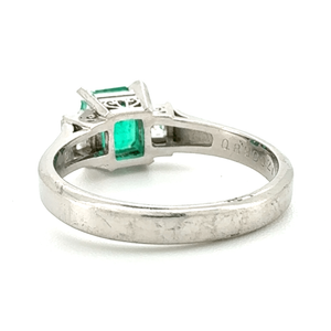 A sophisticated platinum three-stone ring featuring a natural baguette-cut emerald flanked by two emerald-cut diamonds, combining elegance with timeless luxury.